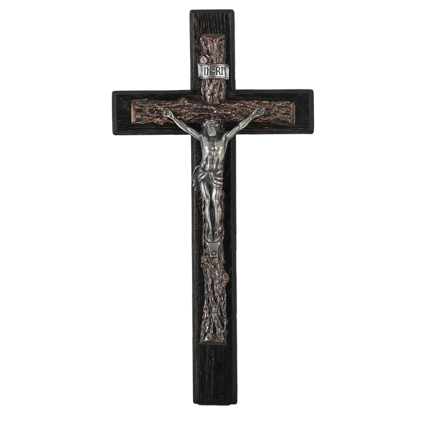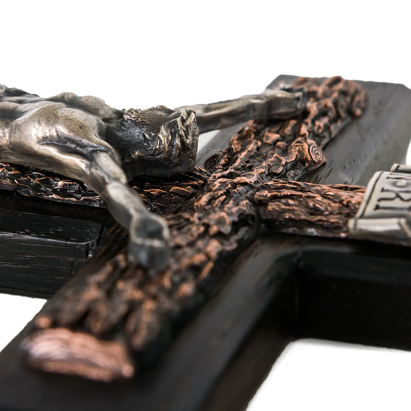 На втором плане находиться металлический крест из меди с имитацией текстуры грубой коры натурального дерева и задняя основа всей композиции изготовлена из натурального травленого дуба.
