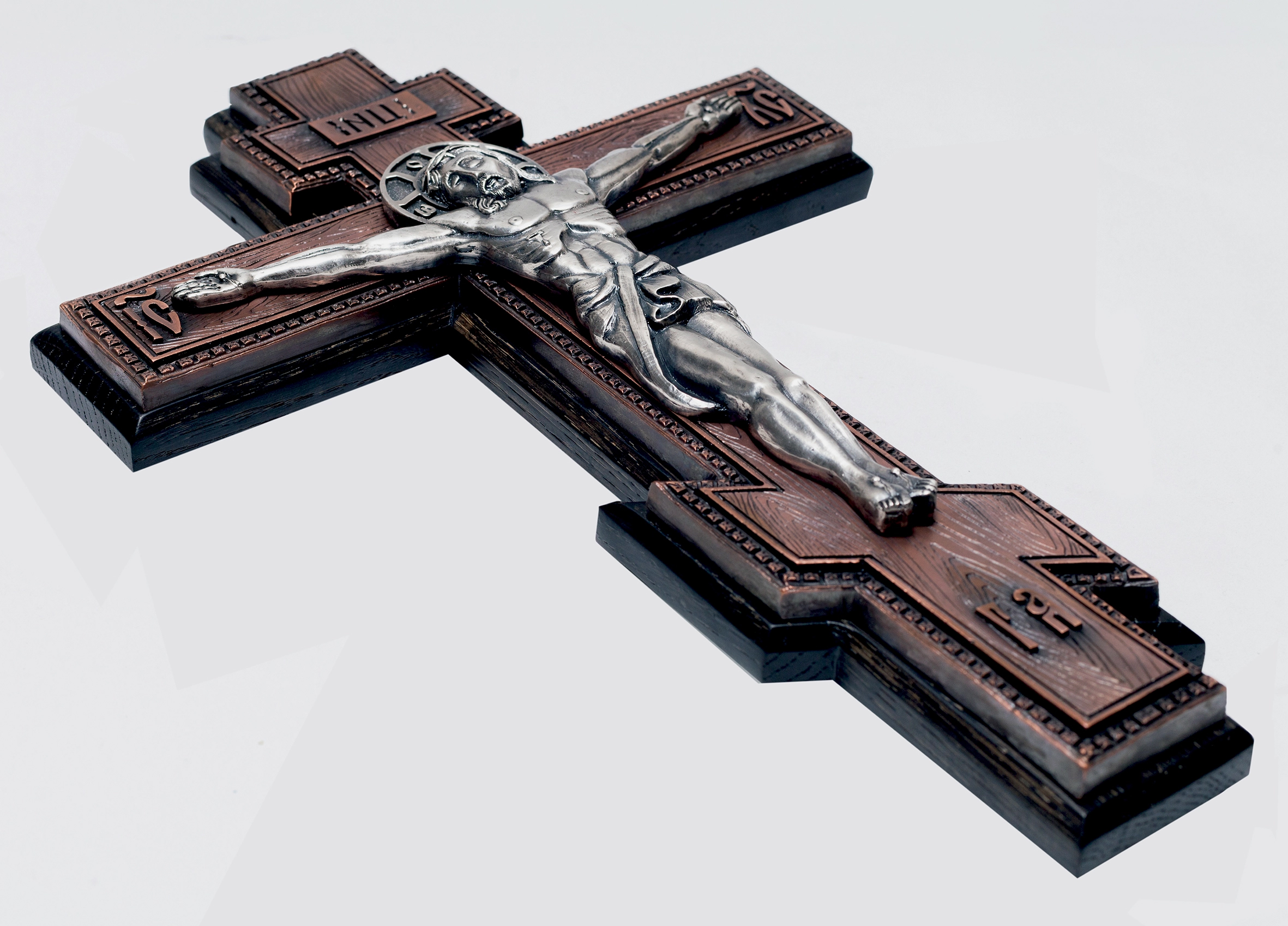 На первом, переднем плане воплощен скульптурный образ распятого Исуса Христа с гальваническим покрытием серебра. Второй план представляет собой металлический медный крест с имитацией текстуры коры дерева. И, наконец, представляем крест заднего плана, который изготовлен из натурального дуба.
