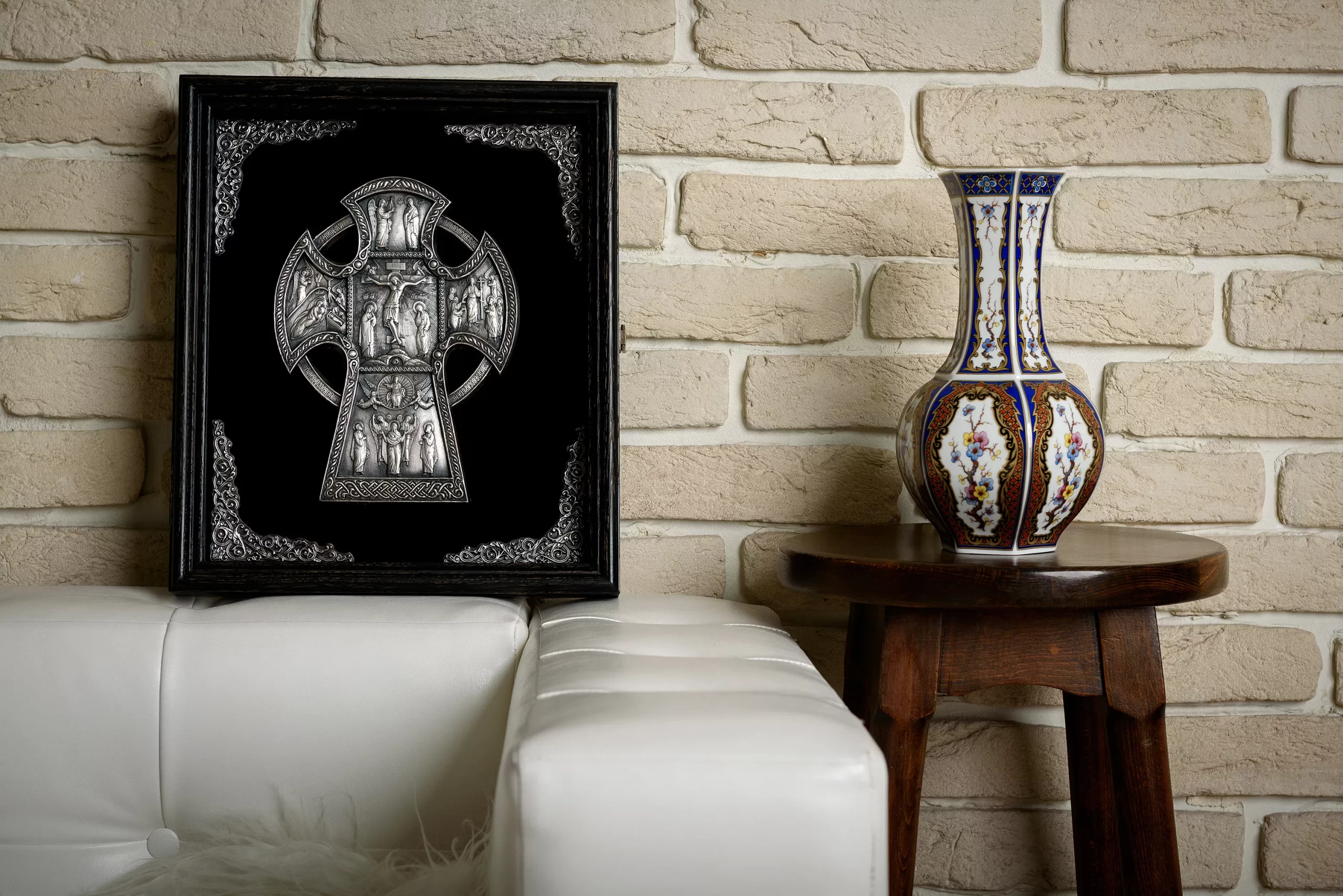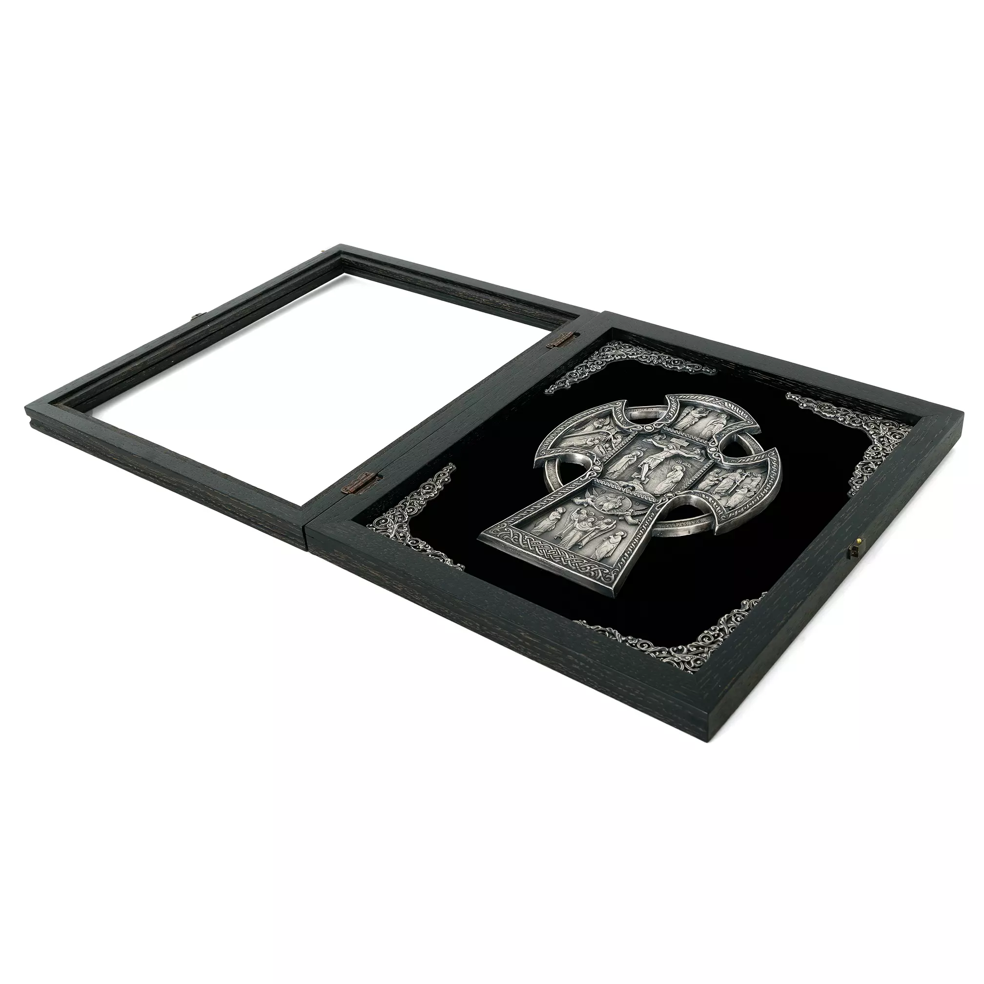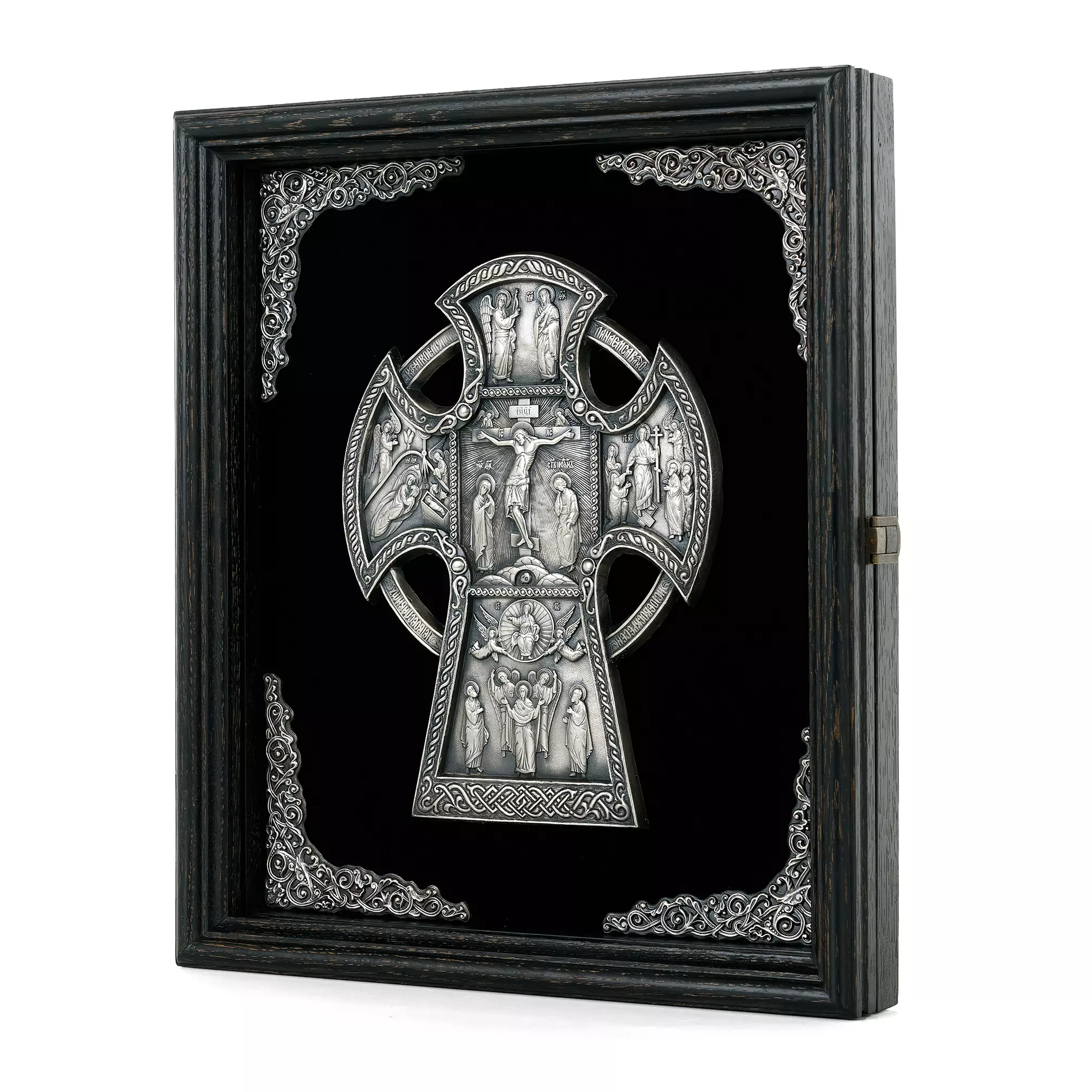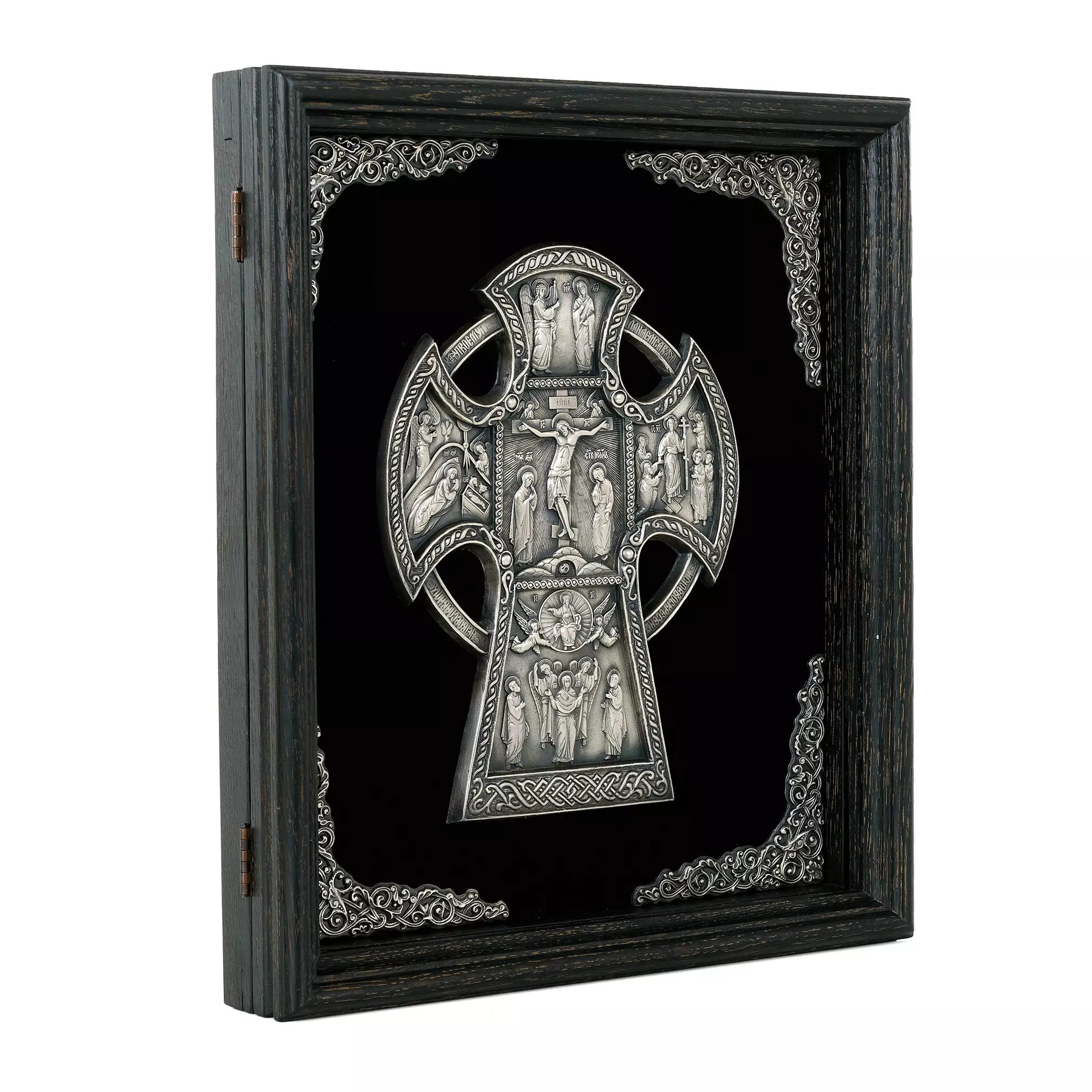 Православный крест с предстоящими «Алексеевский крест»– детальная художественная композиция, находка для любителя и ценителя необычных вещей. Каждая миниатюра удивит высокой детализацией художественно проработанных элементов данной композиции. Надеемся, что Ваша оценка будет достойная и высокая. Техника исполнения, гальванопластика. Материал, медь с гальваническим серебреным покрытием высшей пробы, толщиной 25-30 мкм. Вся композиция уложена на бархатном поле с авторским орнаментом, который отлично смотрится в двойной натуральной раме из благородных сортов дерева.