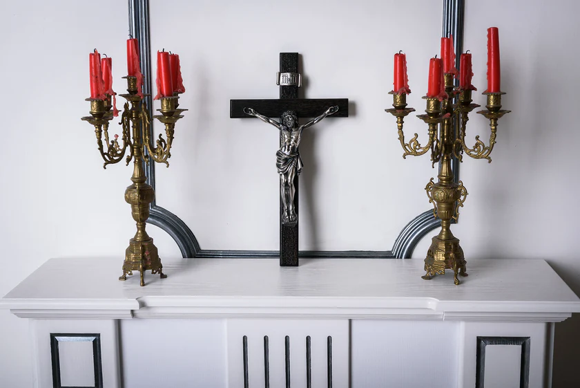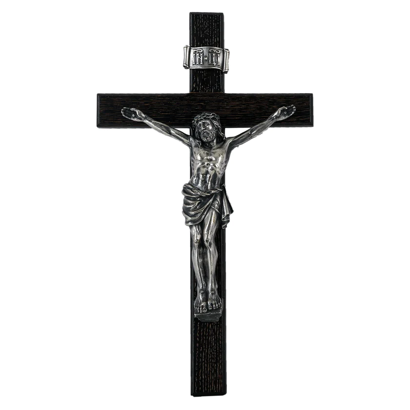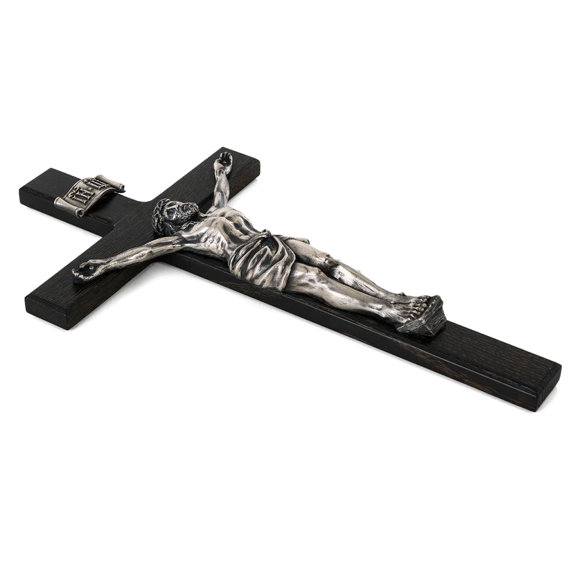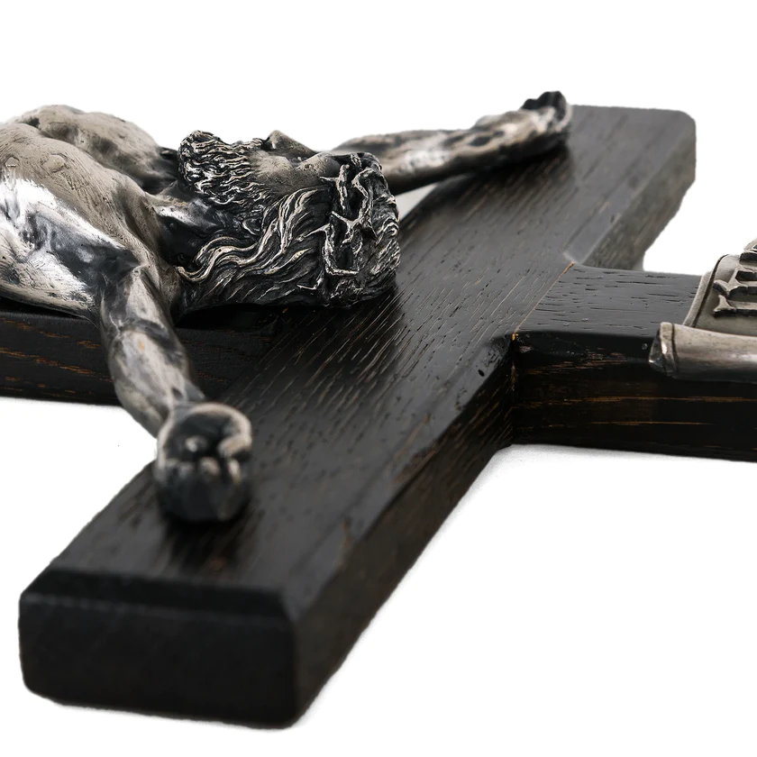 Настенный крест, это более упрощённый вариант авторского распятия модели К-01. Детальная художественная композиция, которая главной особенностью является объемность и проработанные самые мелкие элементы, от черт лица до пластики тела. В работе над скульптурным образом, художник использовал авторские эскизы. Посеребренные элементы композиции удачно сочетается с деревянным, дубовым крестом.