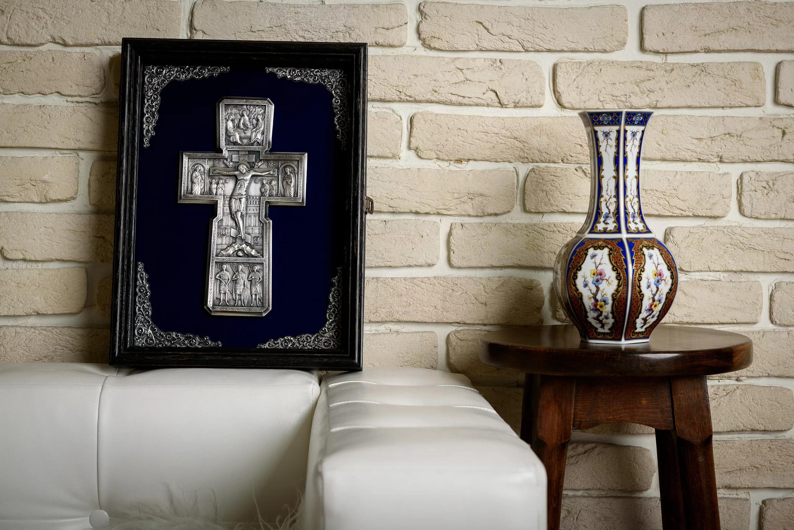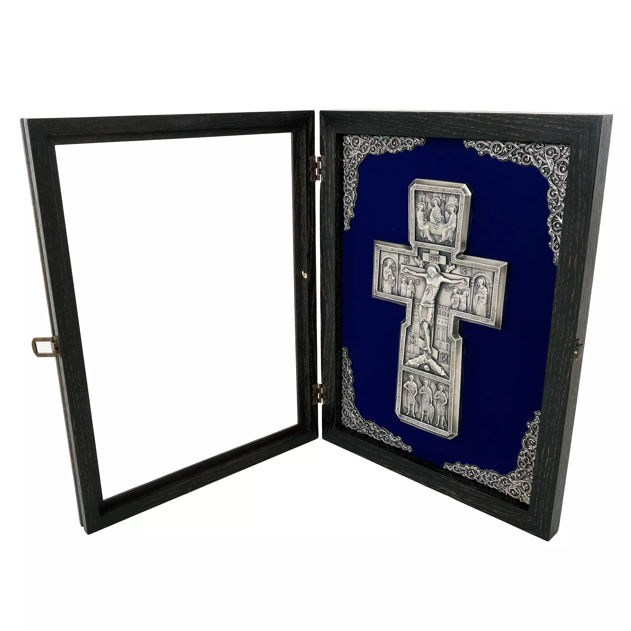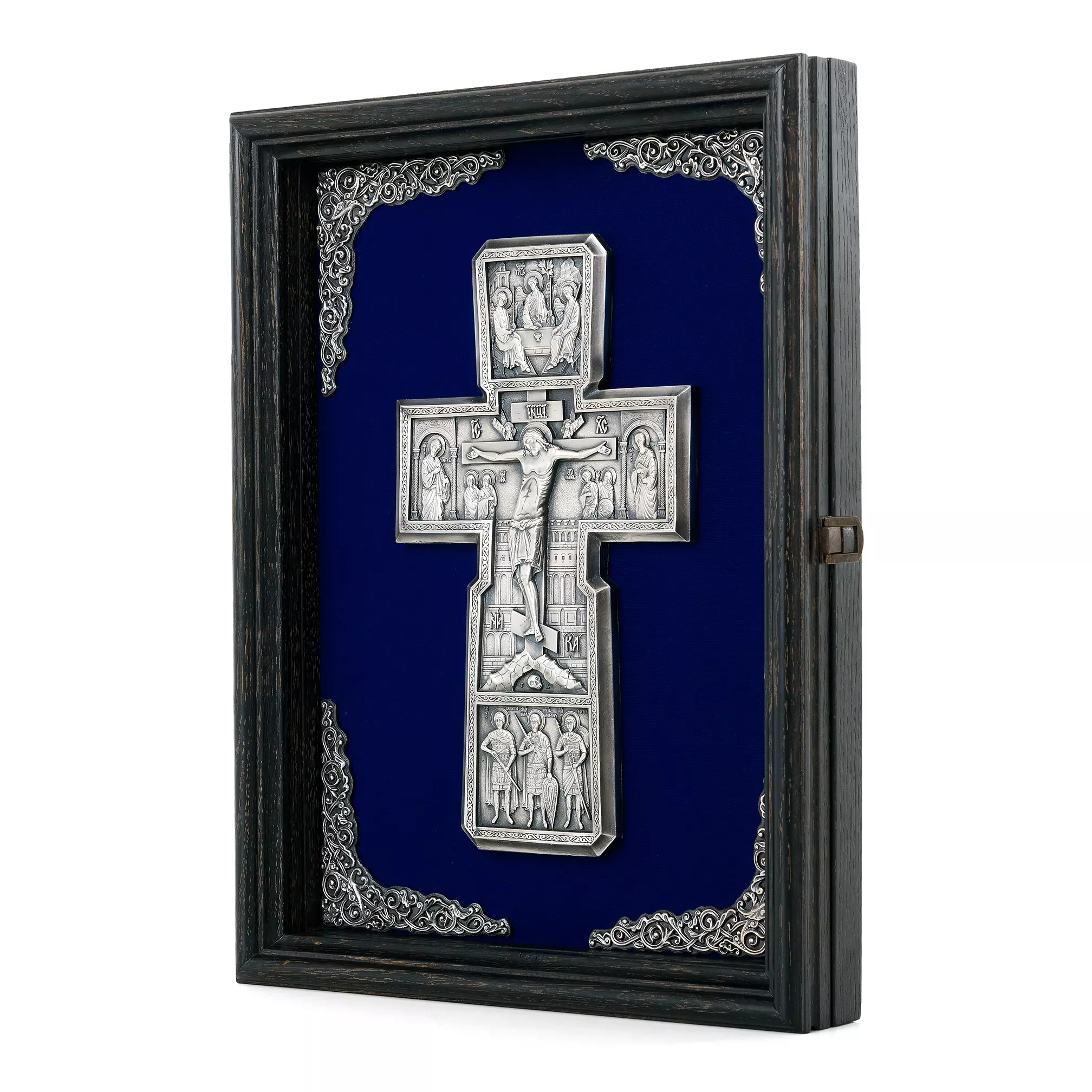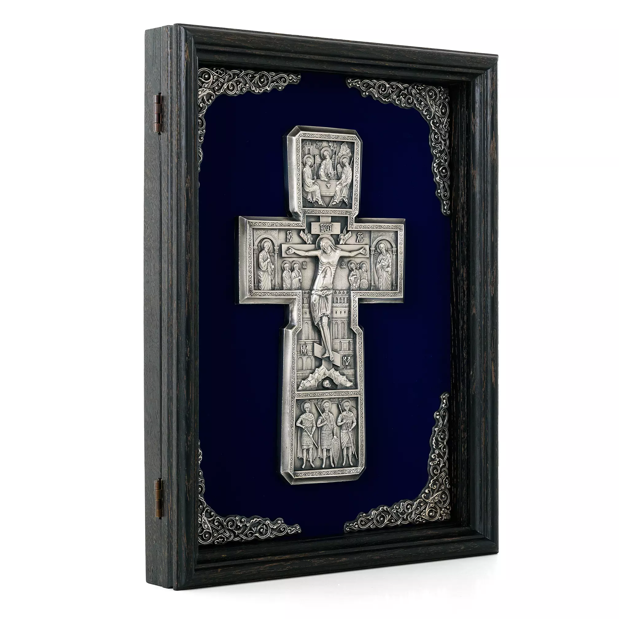 Православный крест с предстоящими – детальная художественная композиция, находка для любителя и ценителя необычных вещей. Каждая миниатюра удивит высокой детализацией художественно проработанных элементов данной композиции. Надеемся, что Ваша оценка будет достойная и высокая. Техника исполнения, гальванопластика. Материал, медь с гальваническим серебреным покрытием высшей пробы, толщиной 25-30 мкм. Вся композиция уложена на бархатном поле с авторским орнаментом, который отлично смотрится в двойной натуральной раме из благородных сортов дерева.