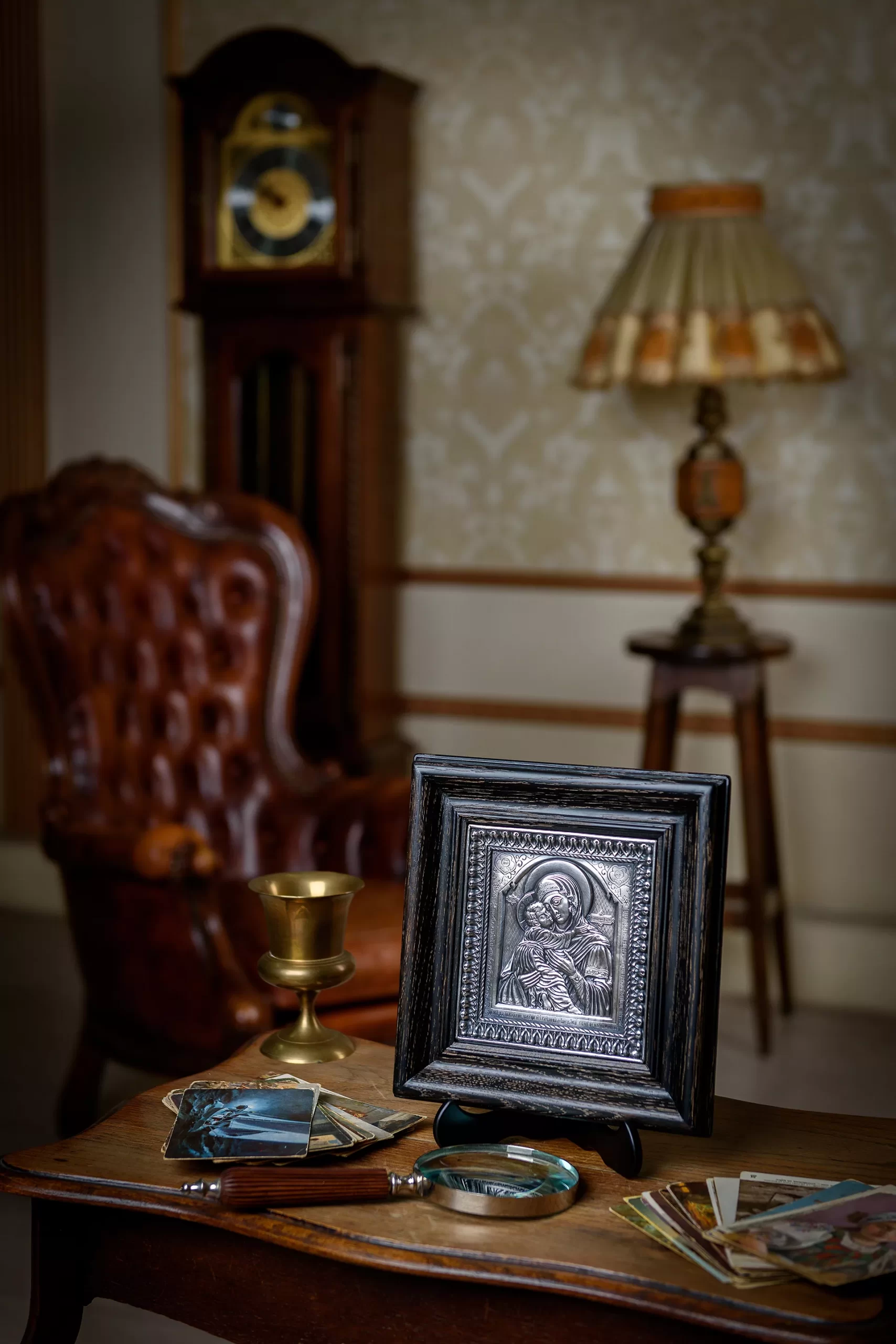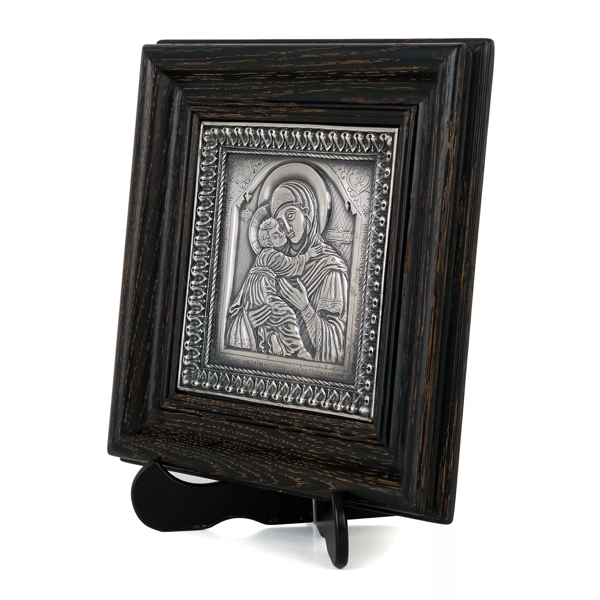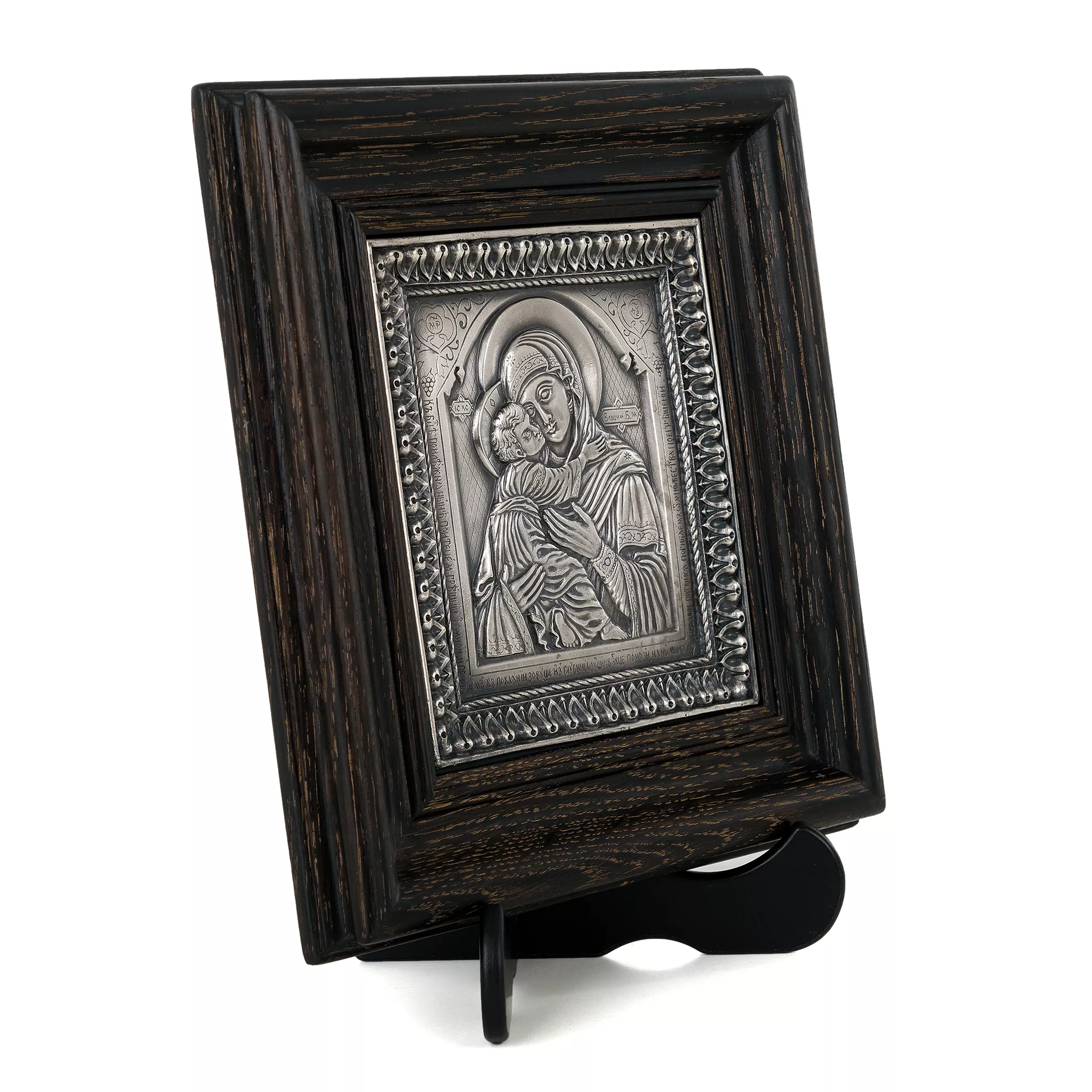 Представляем Вашему вниманию образ иконы Владимирской Божией Матери, изготовленный по старинной технологии, с применением гальванического серебрения толщиной в 25 мкм и последующим химическим чернением и осветлением изделия для придания художественного старинного вида. Рама изготовлена из высококачественного натурального дерева с применением старинных, забытых рецептов искусственного старения.